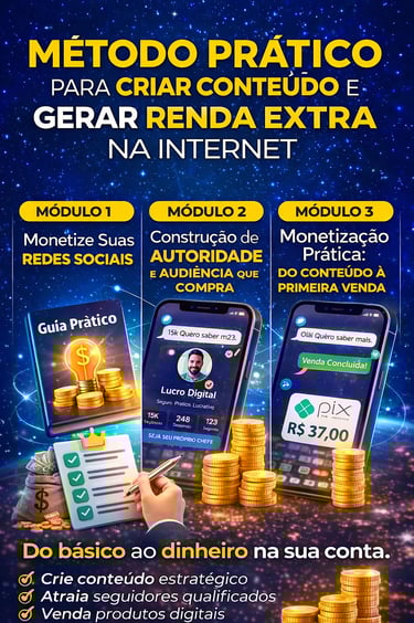 Um método prático que ensina, como criar conteúdo e monetizar redes sociais e gerar renda extra online.